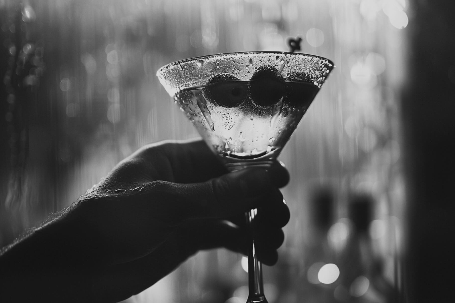 Instructions: Add ingredients to a shaker filled with ice. Stir until well combined and strain into a chilled martini glass. Garnish with four olives. Serves one.